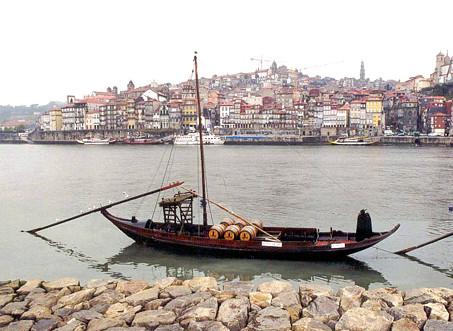 Rabelo repousa no Douro tendo como fundo a Ribeira do Porto
