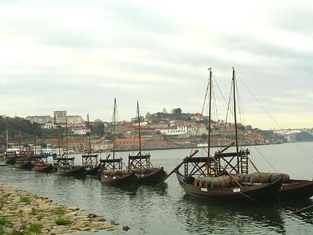 Barcos Rabelo alinhados junto à margem do rio Douro.